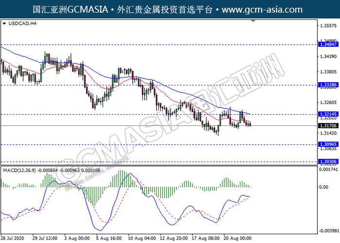 20200824 USDCAD-午间 by keyk | Aug 24, 2020 | 美元兑加元 | 0 comments GCMAsia - USDCAD USDCAD 2020-08-24 USDCAD,H4:美加近期高位承压回落。MACD多头动能略减,短期继续看空回调为主。上方关注1.3215压力和1.3330压力,下方关注1.3095支撑1.3030支撑。