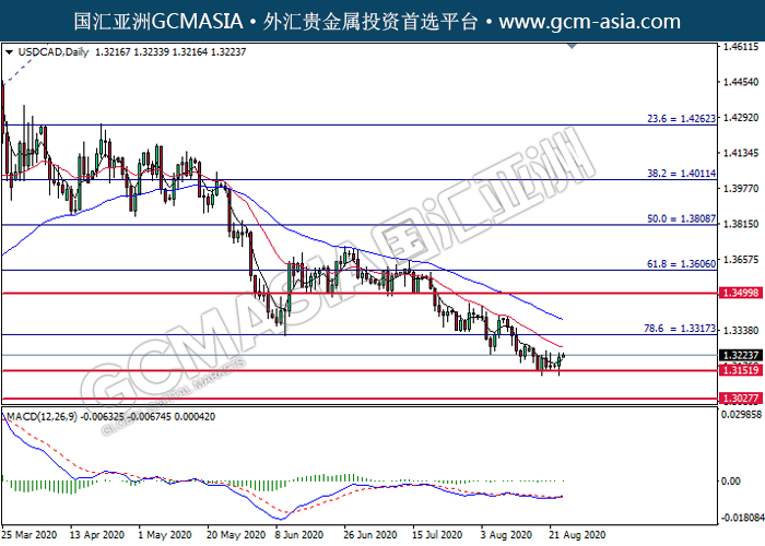 20200825 USDCAD-午间 by keyk | Aug 25, 2020 | 美元兑加元 | 0 comments GCMAsia - USDCAD GBPUSD 2020-08-25 USDCAD,Daily:美加低位反弹。MACD显示空头动能转弱,短期可持续关注多头趋势为主。上方关注1.3315压力和1.3500压力,下方关注1.3150支撑1.3025支撑。
