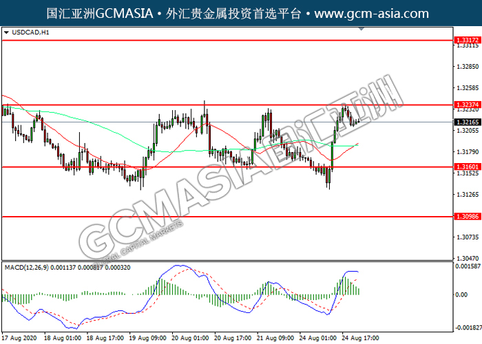 20200825 USDCAD by willy | Aug 25, 2020 | 美元兑加元 | 0 comments GCMAsia-USDCAD USDCAD 2020-08-25 USDCAD,H1:美加震荡下行。MACD多头动能略减,短期可关注空头为主。上方关注1.3235压力和1.3315压力,下方关注1.3160支撑1.3100支撑。