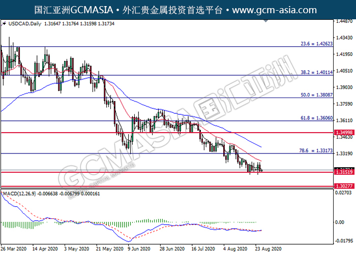 USDCAD,Daily:美加震荡下行,目前测试着支撑位。然而,MACD显示空头动能转弱,短期可持续关注多头反弹为主。上方关注1.3315压力和1.3500压力,下方关注1.3150支撑1.3025支撑。
