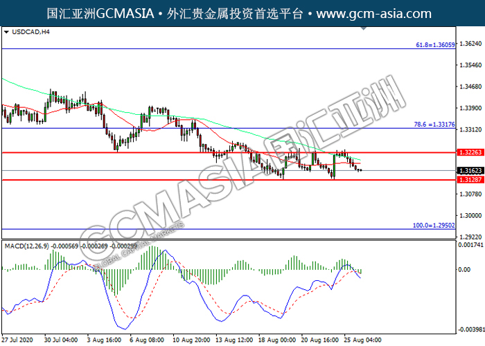 20200826 USDCAD by willy | Aug 26, 2020 | 美元兑加元 | 0 comments GCMAsia-USDCAD USDCAD 2020-08-26 USDCAD,H4:美加震荡下行。MACD空头动能略增,短期可关注空头为主。上方关注1.3225压力和1.3315压力,下方关注1.3130支撑1.2950支撑。