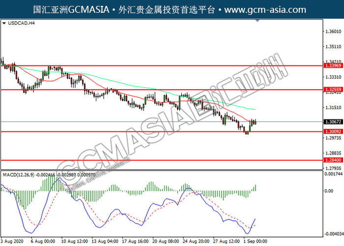 20200902 USDCAD-午间 by willy | Sep 2, 2020 | 美元兑加元 | 0 comments GCMAsia-USDCAD USDCAD 2020-09-02 USDCAD,H4:美加触底反弹上行。,MACD多头动能略增,短期可关注多头反弹为主。上方关注1.3255压力和1.3395压力,下方关注1.3010支撑1.2840支撑。