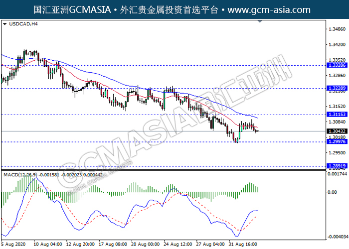 20200903 USDCAD by keyk | Sep 3, 2020 | 美元兑加元 | 0 comments GCMAsia - USDCAD USDCAD 2020-09-03 USDCAD,H4:美加接触平均线后高位回落。MACD多头动能有所略减,短期继续看空回调为主。上方关注1.3115压力和1.3230压力,下方关注1.2995支撑1.2890支撑。