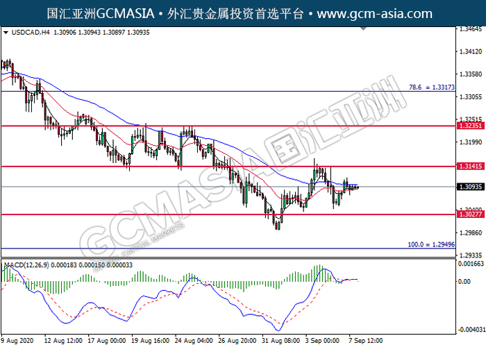 20200908 USDCAD by willy | Sep 8, 2020 | 美元兑加元 | 0 comments GCMAsia-USDCAD USDCAD 2020-09-08 USDCAD,H4:美加低位反弹。由于MACD并没有显示任何信号,建议等到更多信号后才进入市场。上方关注1.3140压力和1.3235压力,下方关注1.3030支撑1.2950支撑。