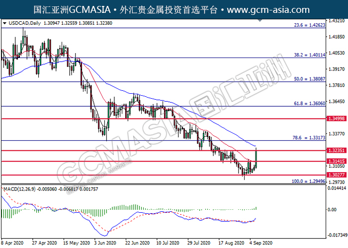 USDCAD,Daily:美加低位反弹,目前测试着压力位。MACD显示多头信号,若突破可持续关注多头为主。上方关注1.3235压力和1.3315压力,下方关注1.3140支撑1.3030支撑。