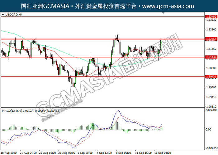 USDCAD,H4:美加低位反弹,目前测试前期压力。MACD已形成金叉,动能转强,若突破可关注多头为主。上方关注1.3235压力和1.3350压力,下方关注1.3145支撑1.3045支撑。