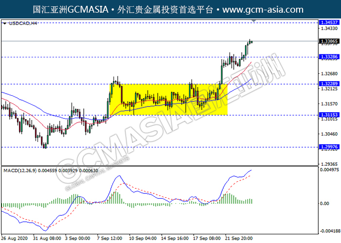 USDCAD,H4:美加突破前期压力,多头排列。然而,MACD多头动能有所略减,短期关注空头回调趋势为主。上方关注1.3455压力和1.3635压力,下方关注1.3330支撑1.3230支撑。
