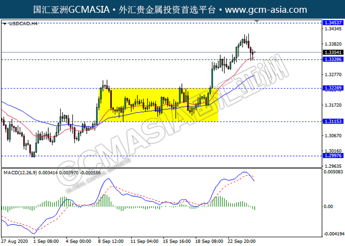 USDCAD,H4:美加高位承压回落,目前测试靠近前期支撑。MACD形成死叉,动能略减,若突破继续看空为主。上方关注1.3455压力和1.3635压力,下方关注1.3330支撑1.3230支撑。