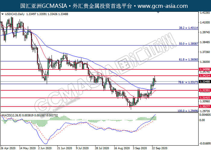 USDCAD,Daily:美加高位承压后回落。MACD显示空头信号,中期可持续关注空头为主。上方关注1.3420压力和1.3500压力,下方关注1.3315支撑1.3235支撑。