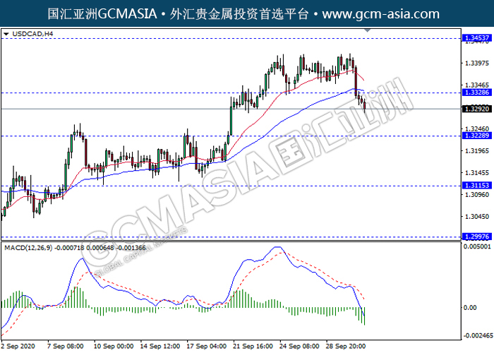 USDCAD,H4:美加突破前期支撑,空头排列。MACD动能持续略减,中期继续看空为主。上方关注1.3330压力和1.3455压力,下方关注1.3230支撑1.3115支撑。