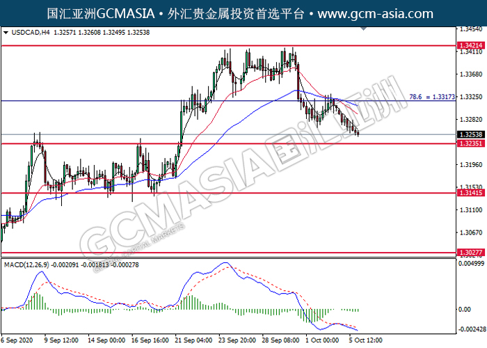 20201006 USDCAD-午间 by keyk | Oct 6, 2020 | 美元兑加元 | 0 comments GCMAsia - USDCAD USDCAD 2020-10-06 USDCAD,H4:美加突破后持续下行。MACD空头动能持续偏强,短期继续看空方向为主。上方关注1.3315压力和1.3420压力,下方关注1.3235支撑1.3140支撑。