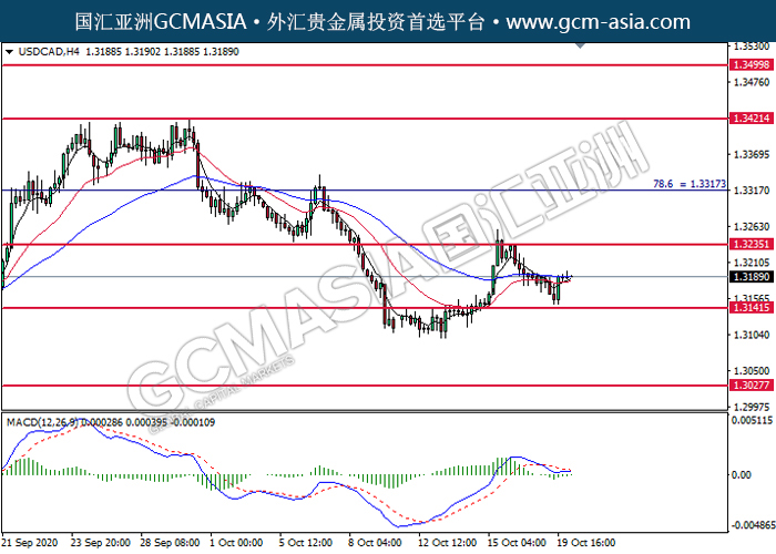 20201020 USDCAD by willy | Oct 20, 2020 | 美元兑加元 | 0 comments GCMAsia-USDCAD USDCAD 2020-10-20 USDCAD,H4:美加低位反弹。MACD转向多头,动能略增,短期可关注多头为主。上方关注1.3235压力和1.3315压力,下方关注1.3140支撑1.3025支撑。