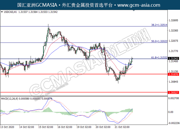 USDCAD,H1:美加突破后持续上行,目前测试着压力位。MACD转向多头,动能略增,若突破可持续关注多头为主。上方关注1.3155压力和1.3200压力,下方关注1.3105支撑1.3055支撑。