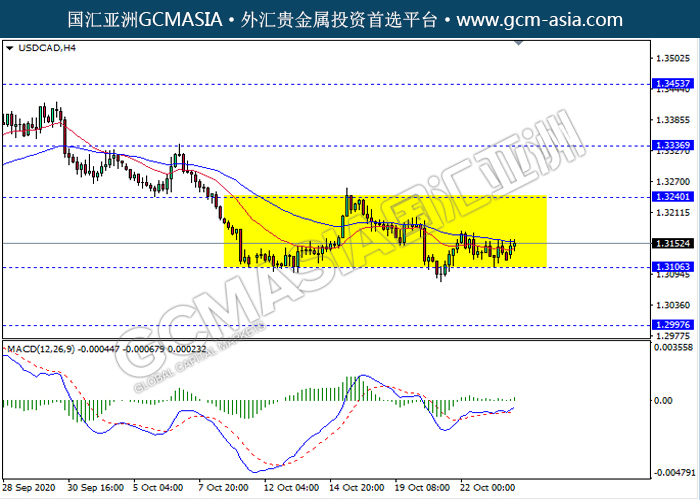 USDCAD,H4:美加仍区间震荡盘在,目前测试靠近前期支撑。然而,MACD显示多头,动能略增,短期关注多头方向为主。上方关注1.3240压力和1.3335压力,下方关注1.3105支撑1.2995支撑。