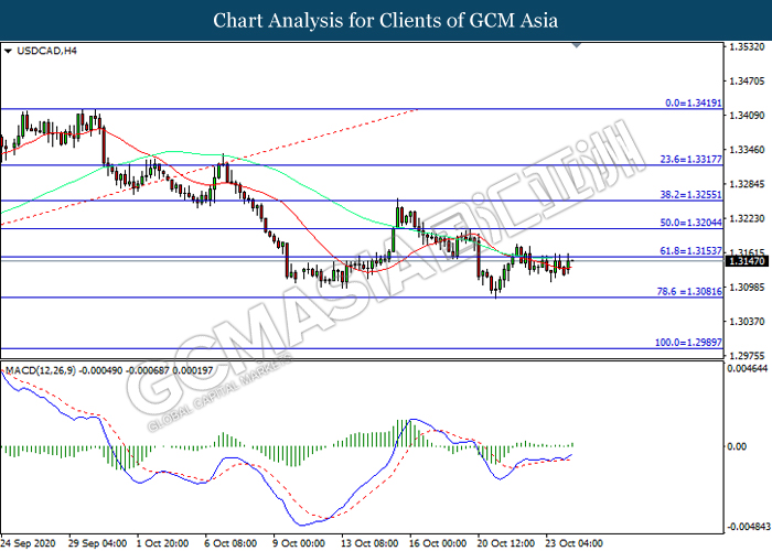 20201026 USDCAD by willy | Oct 26, 2020 | 美元兑加元 | 0 comments GCMAsia-USDCAD USDCAD 2020-10-26 USDCAD,H4:美加震荡盘整,目前测试前期压力。MACD多头动能略增,若突破可关注多头为主。上方关注1.3155压力和1.3205压力,下方关注1.3080支撑1.2990支撑。