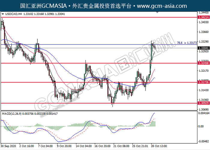 20201029 USDCAD-午间 by keyk | Oct 29, 2020 | 美元兑加元 | 0 comments GCMAsia - USDCAD USDCAD 2020-10-29 USDCAD,H4:美加高位承压后回落。MACD多头动能转弱,短期可关注空头为主。上方关注1.3315压力和1.3420压力,下方关注1.3245支撑1.3175支撑。