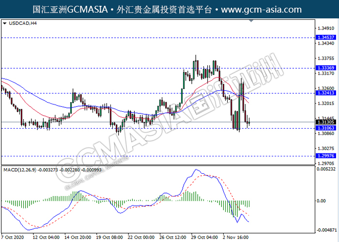 USDCAD,H4:美加空头排列,目前测试前期支撑。MACD动能持续略减,若突破继续关注空头为主。上方关注1.3240压力和1.3335压力,下方关注1.3105支撑1.2995支撑。