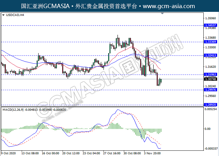 20201106 USDCAD by keyk | Nov 6, 2020 | 美元兑加元 | 0 comments GCMAsia - USDCAD USDCAD 2020-11-06 USDCAD,H4:美加低位反弹上行。MACD空头动能有所略减,短期可继续看多反弹趋势为主。上方关注1.3105压力和1.3240压力,下方关注1.2995支撑1.2890支撑。