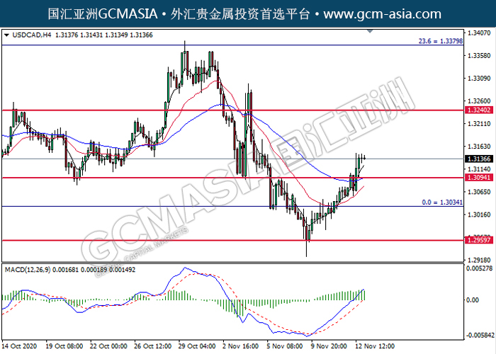 20201113 USDCAD by willy | Nov 13, 2020 | 美元兑加元 | 0 comments GCMAsia-USDCAD USDCAD 2020-11-13 USDCAD,H4: 美加突破后持续上行。MACD动能持续略增,短期可关注多头为主。上方关注1.3240压力和1.3380压力,下方关注1.3095支撑1.3035支撑。