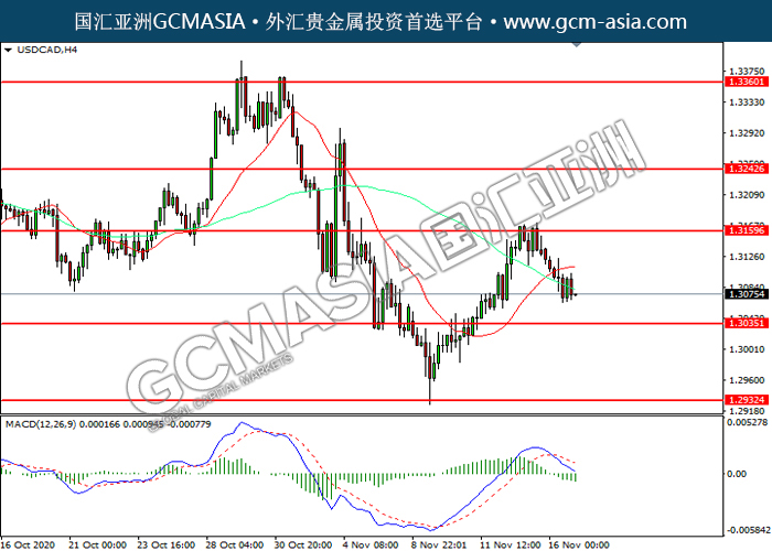 USDCAD,H4:美加震荡下行,目前靠近前期支撑。MACD空头动能有所略增,若下破可关注空头为主。上方关注1.3160压力和1.3245压力,下方关注1.3035支撑1.2930支撑。
