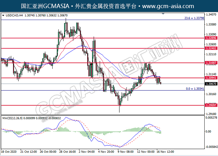 USDCAD,H4: 美加高位承压后回落。MACD动能持续略减,短期可关注空头为主。上方关注1.3095压力和1.3170压力,下方关注1.3035支撑1.2960支撑。