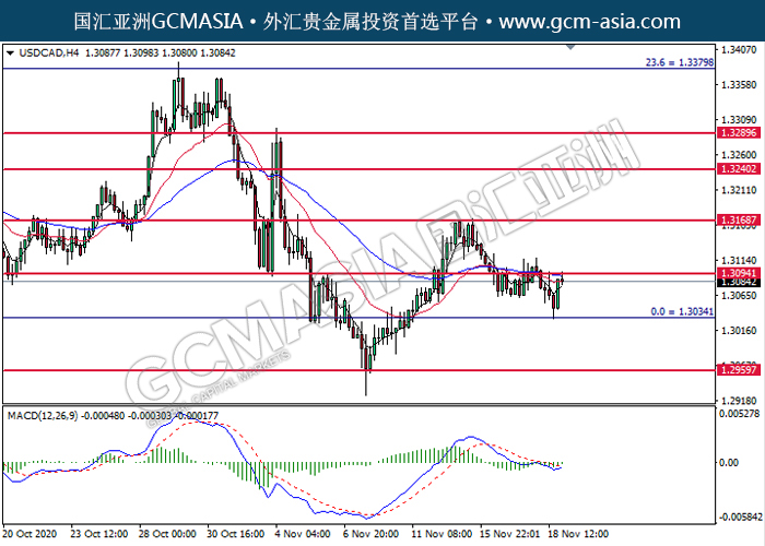 USDCAD,H4: 美加低位反弹,目前测试着压力位。MACD动能持续略增,若突破可关注多头为主。上方关注1.3095压力和1.3170压力,下方关注1.3035支撑1.2960支撑。