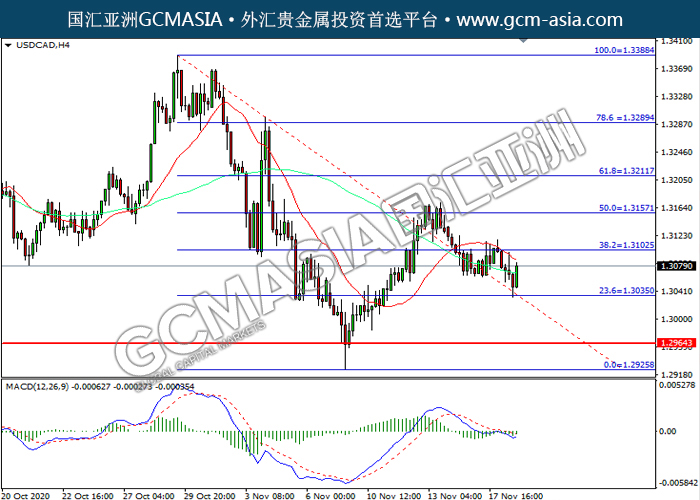 20201119 USDCAD by willy | Nov 19, 2020 | 美元兑加元 | 0 comments GCMAsia-USDCAD USDCAD 2020-11-19 USDCAD,H4:美加低位反弹。MACD空头动能略减,短期可持续关注多头为主。上方关注1.3105压力和1.3155压力,下方关注1.3035支撑1.2965支撑。