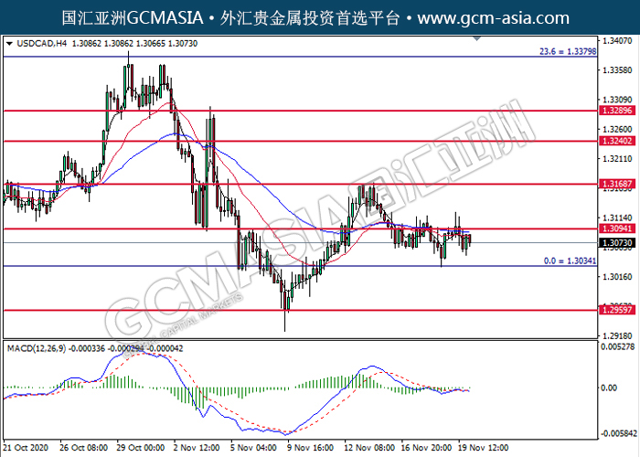 20201120 USDCAD-午间 by keyk | Nov 20, 2020 | 美元兑加元 | 0 comments GCMAsia - USDCAD USDCAD 2020-11-20 USDCAD,H4: 美加高位承压后回落。MACD动能持续略减,短期可关注空头为主。上方关注1.3095压力和1.3170压力,下方关注1.3035支撑1.2960支撑。