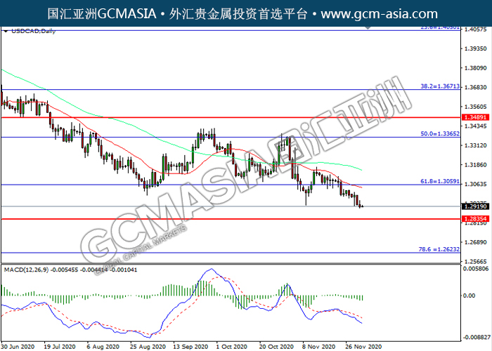 USDCAD,Daily:美加下破前期支撑,震荡下行。MACD空头动能有所略增,短期可关注空头为主。上方关注1.3060压力和1.3365压力,下方关注1.2935支撑1.2625支撑。