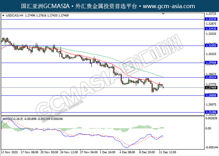 USDCAD,H4:美加高位承压后回落。MACD多头动能略减,短期可继续关注空头方向为主。上方关注1.2830压力和1.2955压力,下方关注1.2680支撑1.2540支撑。