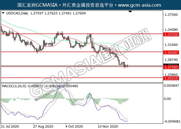 USDCAD,Daily: 美加高位承压后回落,目前测试前期支撑。然而,MACD空头动能略减,短期可关注技术性回调为主。上方关注1.3025压力和1.3370压力,下方关注1.2740支撑1.2520支撑。