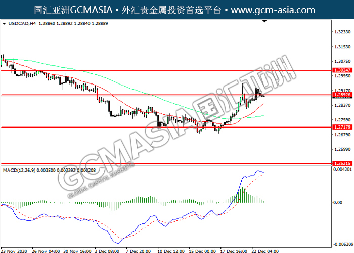 USDCAD,H4:美加震荡盘整,目前测试前期压力。MACD多头动能略减,短期可持续关注空头为主。上方关注1.2895压力和1.3025压力,下方关注1.2720支撑1.2520支撑。