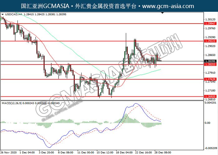 USDCAD,H4: 美加震荡下行,目前测试前期支撑。然而,MACD空头动能略减,短期可关注技术性回调为主。上方关注1.2920压力和1.2995压力,下方关注1.2825支撑1.2765支撑。