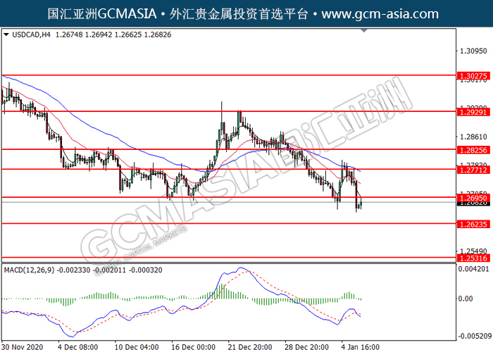 20210106 USDCAD-午间 by willy | Jan 6, 2021 | 美元兑加元 | 0 comments GCMAsia-USDCAD USDCAD 2021-01-06 USDCAD,H4: 美加低位反弹。然而,MACD空头动能略增,短期可关注空头走势为主。上方关注1.2695压力和1.2770压力,下方关注1.2625支撑1.2530支撑。