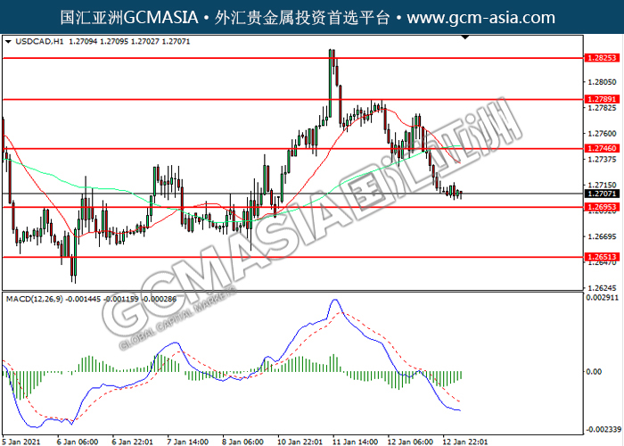 USDCAD,H1: 美加震荡下行,目前测试前期支撑。然而,MACD空头动能略减,短期可关注技术性回调为主。上方关注1.2745压力和1.2790压力,下方关注1.2695支撑1.2650支撑。