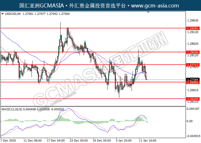 20210113 USDCAD by willy | Jan 13, 2021 | 美元兑加元 | 0 comments GCMAsia-USDCAD USDCAD 2021-01-13 USDCAD,H4: 美加高位承压后回落。MACD显示空头动能转强,短期可持续关注空头趋势。上方关注1.2770压力和1.2825压力,下方关注1.2695支撑1.2625支撑。