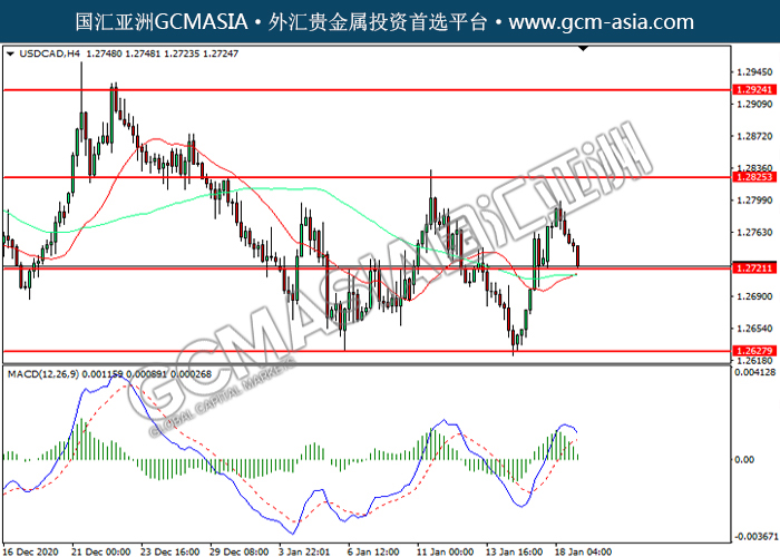 USDCAD,H4:美加空头排列,目前测试前期支撑。MACD多头动能持续略减,若下破可继续关注空头为主。上方关注1.2825压力和1.2925压力,下方关注1.2720支撑1.2630支撑。