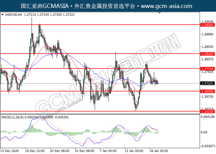 20210120 USDCAD by willy | Jan 20, 2021 | 美元兑加元 | 0 comments GCMAsia-USDCAD USDCAD 2021-01-20 USDCAD,H4: 美加高位承压后回落。MACD显示空头动能略增,短期可关注空头为主。上方关注1.2775压力和1.2825压力,下方关注1.2695支撑1.2625支撑。
