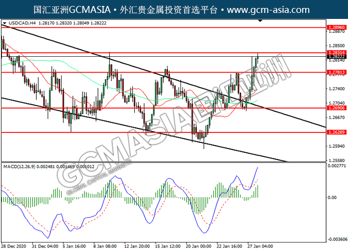 USDCAD,H4:美加震荡下行,目前测试前期压力。MACD多头动能有所略增,若突破可关注多头为主。上方关注1.2830压力和1.2895压力,下方关注1.2780支撑1.2690支撑。