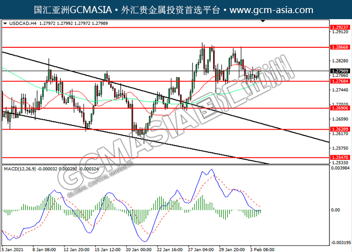 USDCAD,H4:美加震荡盘整,目前测试前期支撑。然而,MACD空头动能有所略减,短期可关注多头为主。上方关注1.2865压力和1.2925压力,下方关注1.2770支撑1.2690支撑。