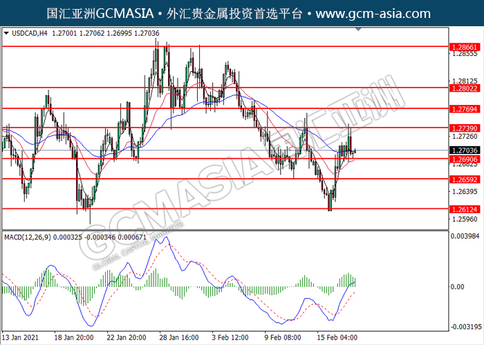 20210218 USDCAD by willy | Feb 18, 2021 | 美元兑加元 | 0 comments GCMAsia - USDCAD USDCAD 2021-02-18 USDCAD,H4: 美加高位承压后回落。MACD显示多头动能略减,短期可关注空头趋势。上方关注1.2740压力和1.2770压力,下方关注1.2690支撑1.2660支撑。