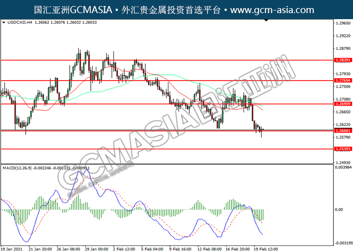 USDCAD,H4:美近震荡下行,目前测试前期支撑。然而,MACD空头动能略减,短期可关注技术性回调为主。上方关注1.2690压力和1.2770压力,下方关注1.2600支撑1.2540支撑。