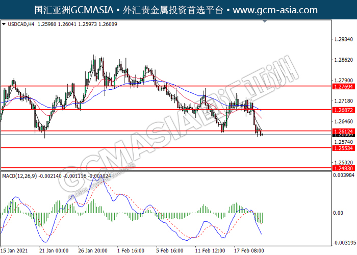 20210222 USDCAD by willy | Feb 22, 2021 | 美元兑加元 | 0 comments GCMAsia - USDCAD USDCAD 2021-02-22 USDCAD,H4: 美加突破后持续下行。MACD显示空头动能略增,短期可关注空头趋势。上方关注1.2610压力和1.2685压力,下方关注1.2555支撑1.2485支撑。