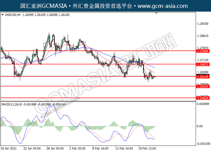 USDCAD,H4: 美加低位反弹,目前测试着压力位。MACD显示空头动能略减,若突破可关注多头趋势。上方关注1.2610压力和1.2685压力,下方关注1.2555支撑1.2485支撑。