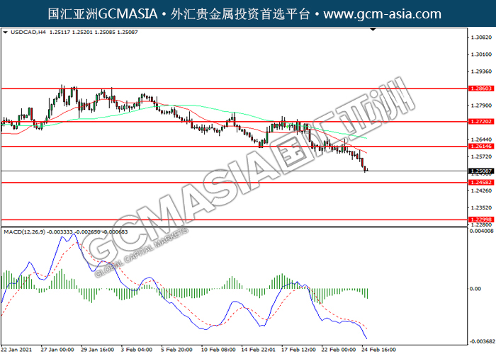 20210225 USDCAD-午间 by keyk | Feb 25, 2021 | 美元兑加元 | 0 comments GCMAsia-USDCAD USDCAD 2021-02-25 USDCAD,H4:美加下破前期支撑,震荡下行。MACD空头动能略增,短期关注空头为主。上方关注1.2615压力和1.2720压力,下方关注1.2460支撑1.2300支撑。