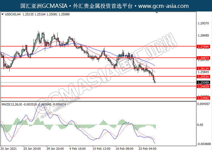 20210225 USDCAD by willy | Feb 25, 2021 | 美元兑加元 | 0 comments GCMAsia - USDCAD USDCAD 2021-02-25 USDCAD,H4: 美加突破后持续下行。MACD显示空头动能略增,短期可关注空头趋势。上方关注1.2555压力和1.2610压力,下方关注1.2485支撑1.2400支撑。