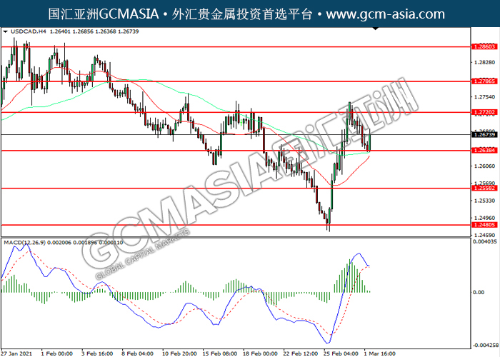 USDCAD,H4:美加近期震荡下行,目前测试前期支撑。MACD多头动能略减,若下破可继续看空方向为主。上方关注1.2720压力和1.2785压力,下方关注1.2640支撑1.2560支撑。