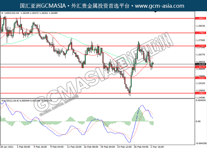 USDCAD,H4:美加近期震荡下行,目前测试前期支撑。MACD空头动能略减,若下破可继续看空方向为主。上方关注1.2720压力和1.2785压力,下方关注1.2615支撑1.2560支撑。
