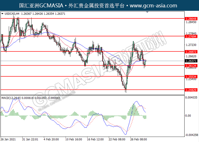 20210303 USDCAD by willy | Mar 3, 2021 | 美元兑加元 | 0 comments GCMAsia - USDCAD USDCAD 2021-03-03 USDCAD,H4: 美加低位反弹。MACD显示空头动能略减,短期可关注多头趋势。上方关注1.2685压力和1.2770压力,下方关注1.2610支撑1.2555支撑。