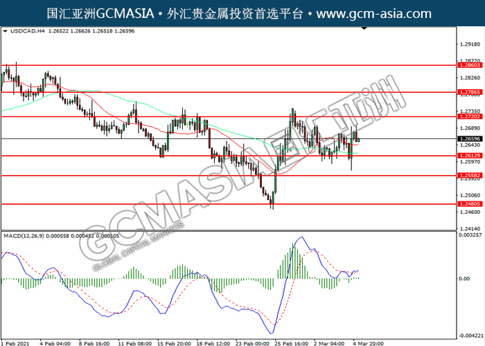20210305 USDCAD-午间 by keyk | Mar 5, 2021 | 美元兑加元 | 0 comments GCMAsia-USDCAD USDCAD 2021-03-05 USDCAD,H4:美加低位反弹。MACD空头动能略减,短期可关注多头为主。上方关注1.2720压力和1.2785压力,下方关注1.2615支撑1.2560支撑。
